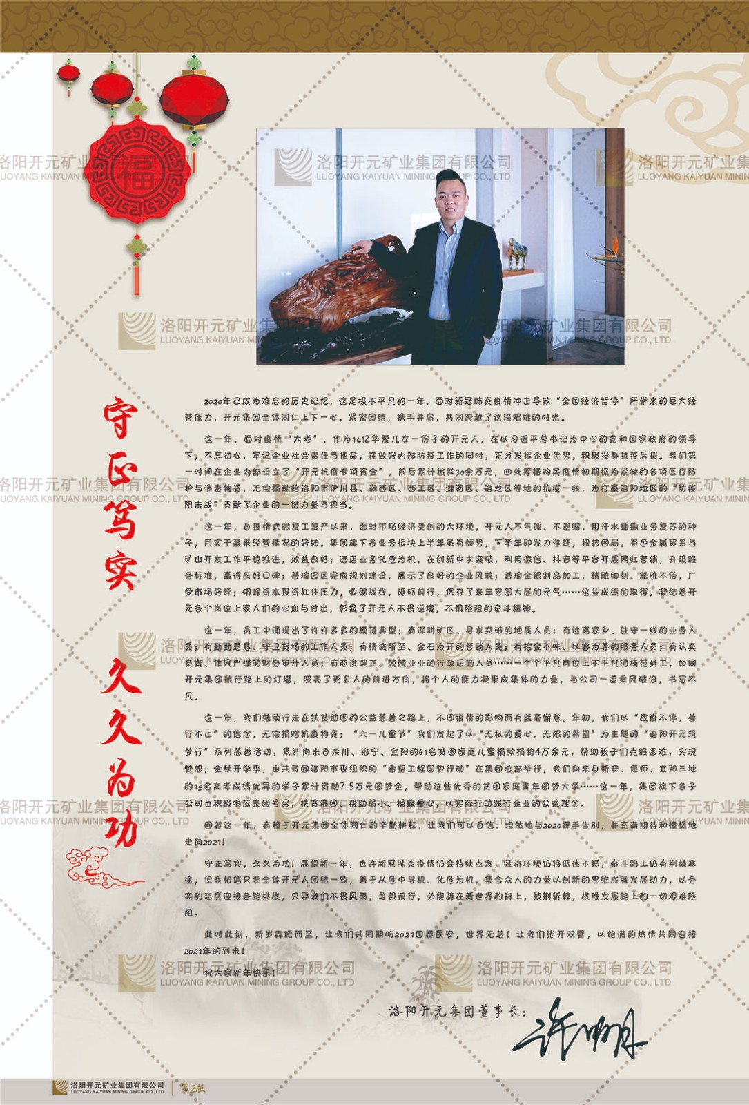 洛陽開元礦業(yè)集團有限公司簡介洛陽開元礦業(yè)集團有限公司,始成立于2006年,位于洛陽市開元大道269號。集團旗下共有五余家全資子公司,業(yè)務涉及有色金屬礦山開發(fā)、礦產(chǎn)品購銷與進出口貿(mào)易、房地產(chǎn)開發(fā)、文化藝術、企業(yè)管理與咨詢、資本投資等多個領域。民建河南省委委員、民建河南省委企業(yè)委副主任、民建洛陽市委委員、企業(yè)委主任、洛陽民建企業(yè)家協(xié)會會長許明月是公司創(chuàng)始人,現(xiàn)任洛陽開元礦業(yè)集團有限公司董事長。在礦業(yè)領域,洛陽開元礦業(yè)集團擁有多家實力雄厚的子公司:貴州開元礦業(yè)有限公司探、采礦權面積共11.33平方公里;興海縣銅鑫礦業(yè)有限公司探礦權面積8.76平方公里,礦山資源潛力巨大;2021年,開元集團與盧氏中科礦業(yè)有限公司開展戰(zhàn)略合作。盧氏中科礦業(yè)有限公司專注于有色金屬的浮選、加工和銷售,擁有強大的技術支撐平臺,是集探、采、選、冶、研為一體的中大型綜合礦業(yè)企業(yè)。目前,盧氏中科王家河1000噸選礦廠已成功投產(chǎn),雙河金礦、柳關欒盧鉛鋅礦相繼順利開工,樓房銀礦與圪老灣鉛鋅礦的深部探礦重大突破,標志著礦山版圖取得重大進展,為開元集團后續(xù)發(fā)展奠定了堅實基礎。在文化傳媒領域,洛陽市明月美術館通過豐富多樣的藝術展覽、學術研討和公共教育活動,努力打造一個集展覽、交流、教育、研究為一體的綜合性藝術平臺。此外,在金融投資領域,開元集團旗下的北京明峰資本管理有限公司專注于投資具有高增長潛力的優(yōu)秀企業(yè),特別是高科技、新能源、環(huán)保等新興產(chǎn)業(yè),為客戶提供個性化的資產(chǎn)配置服務。在做好企業(yè)經(jīng)營的同時,開元集團始終不忘企業(yè)的社會責任和家國情懷,以突出的愛心公益事跡,開展了一系列公益慈善活動:“民建林”公益事業(yè)通過“思源基金”“幫幫公益”線上公益平臺,與眾多愛心人士籌措資金20余萬元;資助541名貧困大學生共計270余萬元,推進“數(shù)字助力——河南AI人才培養(yǎng)”;捐款10萬元,馳援京津冀、黑龍江洪水地質災害……公司于2017年底被洛陽市慈善總會評為“洛陽慈善風云榜——十大愛心集體”。洛陽開元礦業(yè)集團有限公司秉承持續(xù)發(fā)展理念,憑借多年來良好的企業(yè)信譽與經(jīng)營業(yè)績,與全國多家企業(yè)建立了良好合作關系,受到社會各界的一致好評,多次榮獲“納稅標兵”“先進企業(yè)”“招商引資模范企業(yè)”等榮譽稱號。回望來時路,開元人勠力同心,以“闖”的精神和“創(chuàng)”的勁頭,一路披荊斬棘,踏過千山萬水;展望新未來,開元人凝心聚力,不執(zhí)于“舊”,無畏于“新”,秉承“勇于跨越,追求卓越”的企業(yè)精神,乘著國家高質量發(fā)展新征程的東風,跨過高山,越過大海,向著集團多元化、國際化的目標,逐夢遠航,跨越前行!