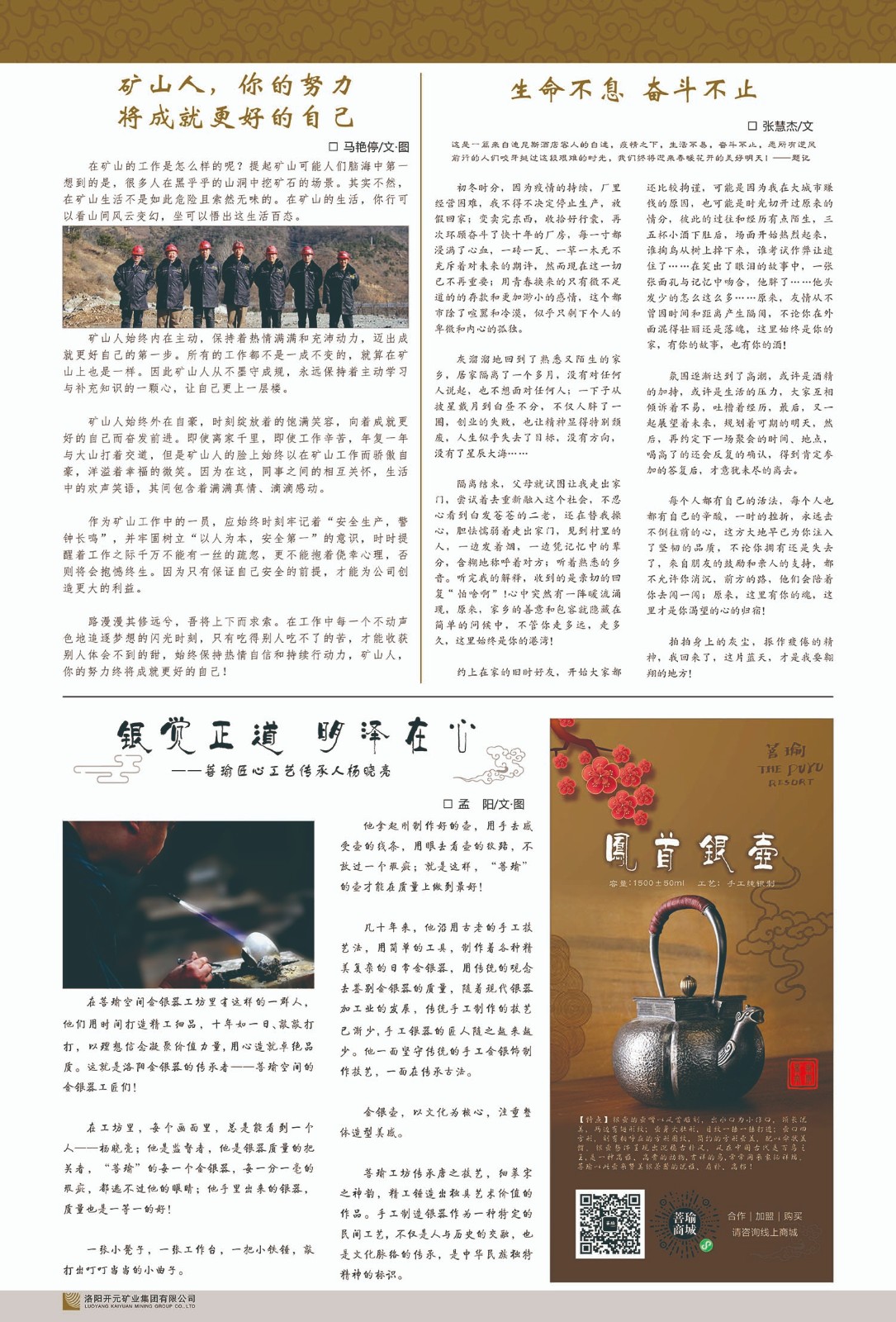 洛陽開元礦業(yè)集團(tuán)有限公司簡介洛陽開元礦業(yè)集團(tuán)有限公司,始成立于2006年,位于洛陽市開元大道269號。集團(tuán)旗下共有五余家全資子公司,業(yè)務(wù)涉及有色金屬礦山開發(fā)、礦產(chǎn)品購銷與進(jìn)出口貿(mào)易、房地產(chǎn)開發(fā)、文化藝術(shù)、企業(yè)管理與咨詢、資本投資等多個領(lǐng)域。民建河南省委委員、民建河南省委企業(yè)委副主任、民建洛陽市委委員、企業(yè)委主任、洛陽民建企業(yè)家協(xié)會會長許明月是公司創(chuàng)始人,現(xiàn)任洛陽開元礦業(yè)集團(tuán)有限公司董事長。在礦業(yè)領(lǐng)域,洛陽開元礦業(yè)集團(tuán)擁有多家實(shí)力雄厚的子公司:貴州開元礦業(yè)有限公司探、采礦權(quán)面積共11.33平方公里;興海縣銅鑫礦業(yè)有限公司探礦權(quán)面積8.76平方公里,礦山資源潛力巨大;2021年,開元集團(tuán)與盧氏中科礦業(yè)有限公司開展戰(zhàn)略合作。盧氏中科礦業(yè)有限公司專注于有色金屬的浮選、加工和銷售,擁有強(qiáng)大的技術(shù)支撐平臺,是集探、采、選、冶、研為一體的中大型綜合礦業(yè)企業(yè)。目前,盧氏中科王家河1000噸選礦廠已成功投產(chǎn),雙河金礦、柳關(guān)欒盧鉛鋅礦相繼順利開工,樓房銀礦與圪老灣鉛鋅礦的深部探礦重大突破,標(biāo)志著礦山版圖取得重大進(jìn)展,為開元集團(tuán)后續(xù)發(fā)展奠定了堅實(shí)基礎(chǔ)。在文化傳媒領(lǐng)域,洛陽市明月美術(shù)館通過豐富多樣的藝術(shù)展覽、學(xué)術(shù)研討和公共教育活動,努力打造一個集展覽、交流、教育、研究為一體的綜合性藝術(shù)平臺。此外,在金融投資領(lǐng)域,開元集團(tuán)旗下的北京明峰資本管理有限公司專注于投資具有高增長潛力的優(yōu)秀企業(yè),特別是高科技、新能源、環(huán)保等新興產(chǎn)業(yè),為客戶提供個性化的資產(chǎn)配置服務(wù)。在做好企業(yè)經(jīng)營的同時,開元集團(tuán)始終不忘企業(yè)的社會責(zé)任和家國情懷,以突出的愛心公益事跡,開展了一系列公益慈善活動:“民建林”公益事業(yè)通過“思源基金”“幫幫公益”線上公益平臺,與眾多愛心人士籌措資金20余萬元;資助541名貧困大學(xué)生共計270余萬元,推進(jìn)“數(shù)字助力——河南AI人才培養(yǎng)”;捐款10萬元,馳援京津冀、黑龍江洪水地質(zhì)災(zāi)害……公司于2017年底被洛陽市慈善總會評為“洛陽慈善風(fēng)云榜——十大愛心集體”。洛陽開元礦業(yè)集團(tuán)有限公司秉承持續(xù)發(fā)展理念,憑借多年來良好的企業(yè)信譽(yù)與經(jīng)營業(yè)績,與全國多家企業(yè)建立了良好合作關(guān)系,受到社會各界的一致好評,多次榮獲“納稅標(biāo)兵”“先進(jìn)企業(yè)”“招商引資模范企業(yè)”等榮譽(yù)稱號。回望來時路,開元人勠力同心,以“闖”的精神和“創(chuàng)”的勁頭,一路披荊斬棘,踏過千山萬水;展望新未來,開元人凝心聚力,不執(zhí)于“舊”,無畏于“新”,秉承“勇于跨越,追求卓越”的企業(yè)精神,乘著國家高質(zhì)量發(fā)展新征程的東風(fēng),跨過高山,越過大海,向著集團(tuán)多元化、國際化的目標(biāo),逐夢遠(yuǎn)航,跨越前行!